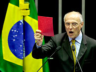 O senador petista Eduardo Suplicy (SP) defende a renúncia de José Sarney (PMDB-AP) da presidência da Casa. Suplicy sobe o tom e, como em um juiz de futebol, puxa um cartão vermelho do bolso