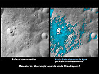 A Nasa, agência espacial americana, divulga uma imagem captada pelo Mapeador de Mineralogia Lunar, equipamento americano carregado pela sonda indiana Chandrayann-1, que mostra a forte absorção de água no solo do satélite