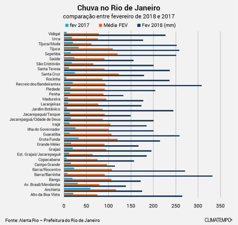 O gráfico mostra o volume de chuva acumulado nos pontos de medição do Alerta Rio/Prefeitura do Rio de Janeiro em fevereiro de 2018 (azul escuro), em fevereiro de 2017 (azul claro) e a média normal de chuva para o mês (laranja).