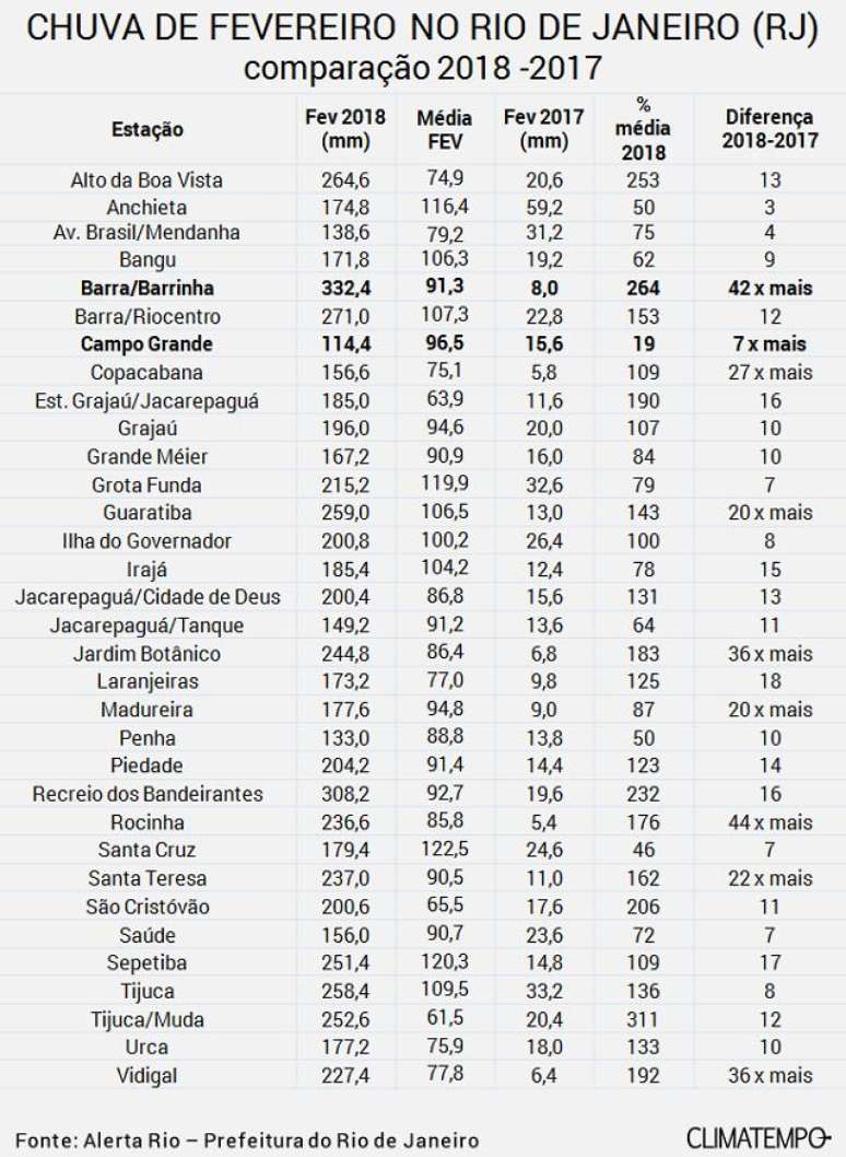Mas o maior volume de chuva acumulado durante o mês, nos locais de medição do Alerta-Rio, foi de 332,4 mm no ponto Barra/Barrinha. Este volume de chuva foi muito impressionante porque ficou 264% acima da média de chuva para fevereiro neste local, ou mais de 3 vezes acima da chuva normal para o mês. A média de chuva para este local em fevereiro é de 91,3 mm. A chuva de fevereiro de 2018 foi 42 vezes maior do que a chuva de fevereiro de 2017, que teve um total de apenas 8 mm.