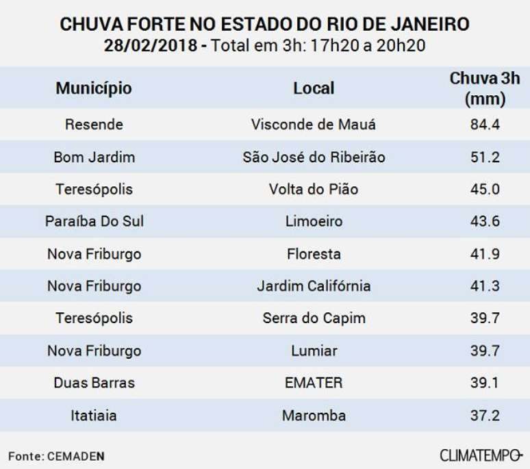 Voltou a chover forte em várias áreas do estado do Rio de Janeiro na tarde e noite desta quarta-feira, 28 de fevereiro. Desta vez, as nuvens mais carregadas não chegaram a cidade do Rio de Janeiro, onde choveu muito pouco. Mas a chuva foi forte em locais da Baixada Fluminense, da Região Serrana, no Vale do Paraíba e Sul do Rio de Janeiro. Em apenas 3 horas de chuva, entre 17h20 e 20h20, o CEMADEN - Centro Nacional de Monitoramento e Alertas de Desastres Naturais - registrou 84 mm na região de Resende, 40% da média de chuva normal para fevereiro que é de aproximadamente 209 mm. Segundo o Instituto Nacional de Meteorologia choveu 251 mm sobre Resende em de fevereiro, até 21 horas do dia 28/2/18.