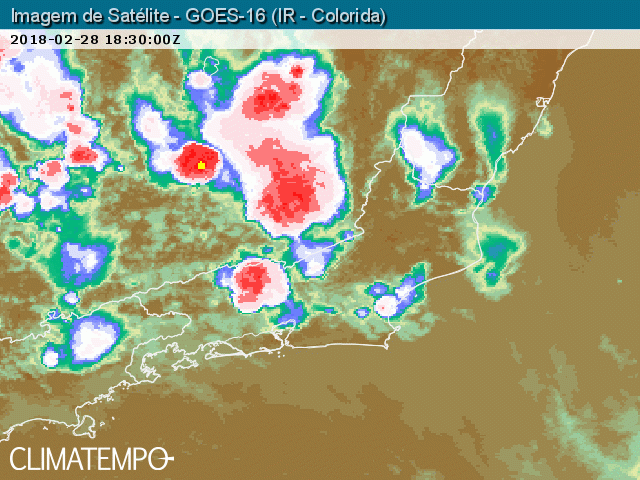 As imagens captadas pelo satélite meteorológico GOES 16 entre 15h30 e 20h00 de 28/2/2018 mostraram que parte das nuvens carregadas (manchas vermelhas) cresceu sobre o próprio estado do Rio de Janeiro e outras avançaram de Minas Gerais e de São Paulo para o Rio de Janeiro. Situações como esta podem se repetir nos próximos dias.