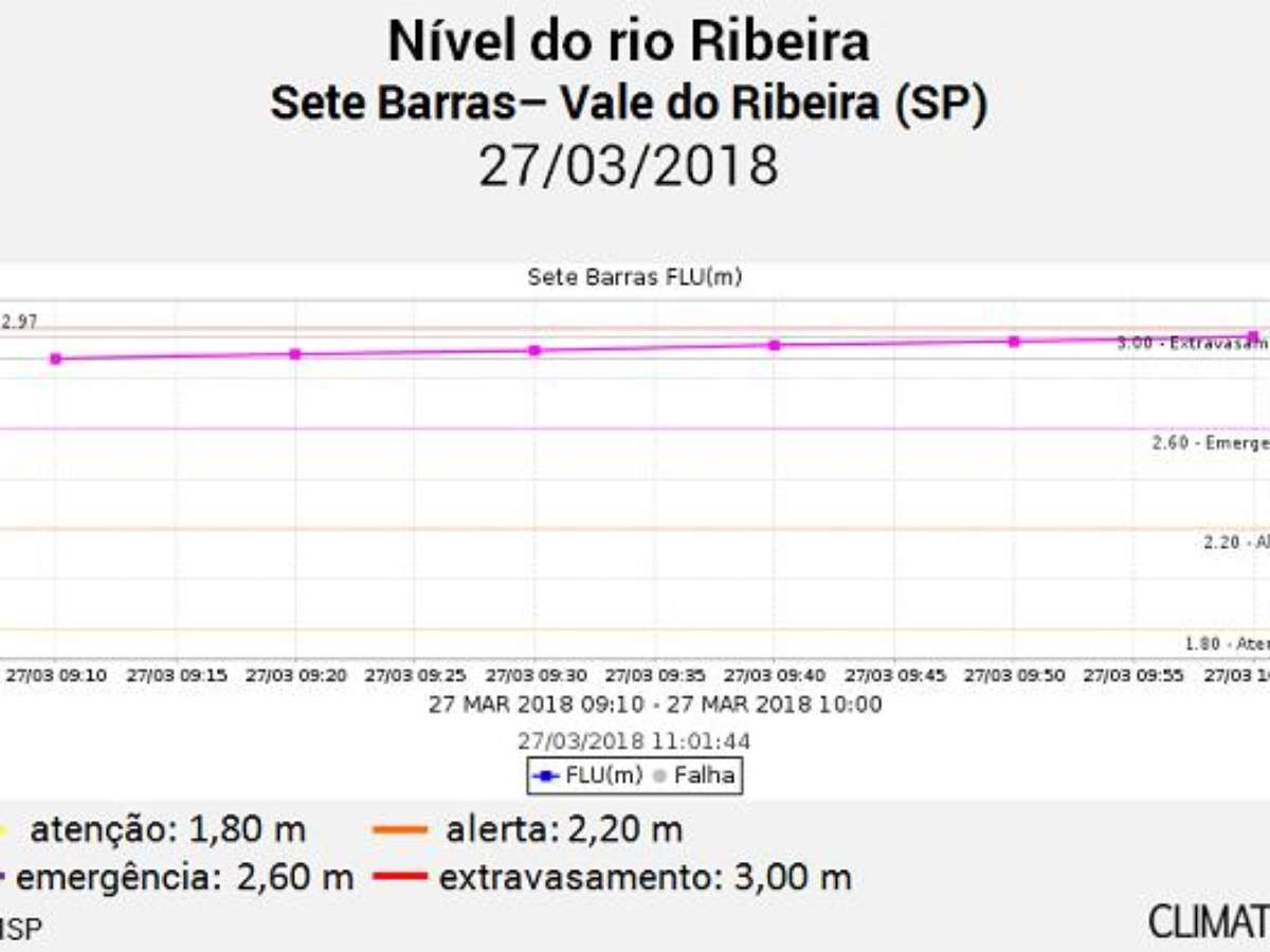 Segundo informações do SAISP (Sistema de Alerta e Inundações de São Paulo), o rio Ribeira de Iguape amanheceu esta terça-feira na cota de emergência. Às 10h10, o nível do rio estava em 2,99 metros, sendo que a cota de extravasamento é de 3,00 metros. Às 11 horas o nível do rio era de 3,07 metros. Às 11h40, o nível do rio Ribeira subiu para 3,13 metros.