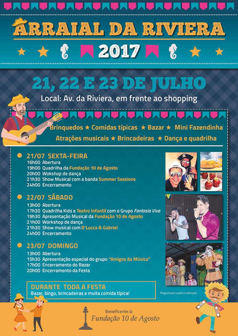 O Arraial da Riviera 2017, festa beneficente à Fundação 10 de Agosto, promete aquecer os ânimos do público durante os dias 21, 22 e 23 de julho. Fazem parte da programação: shows musicais, teatro infantil, brinquedos e brincadeiras, bingo, bazar e barracas com muita comida típica em todos os dias. Local: Av. da Riviera, em frente ao Shopping. Informações pelo telefone: (13) 3368-0768.