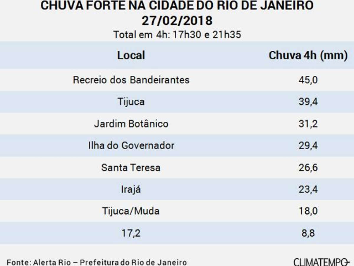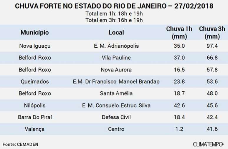 Confira alguns volumes de chuva registrados pelo Alerta Rio - Prefeitura do Rio de Janeiro na capital fluminense e também pelo CEMADEN - Centro Nacional de Monitoramento e Alertas de Desastres Naturais - em outras áreas do estado.