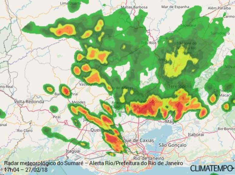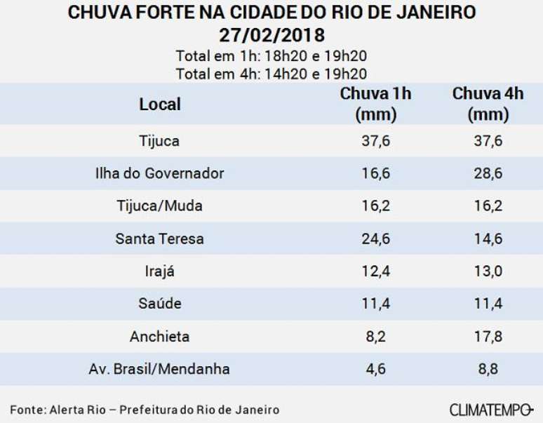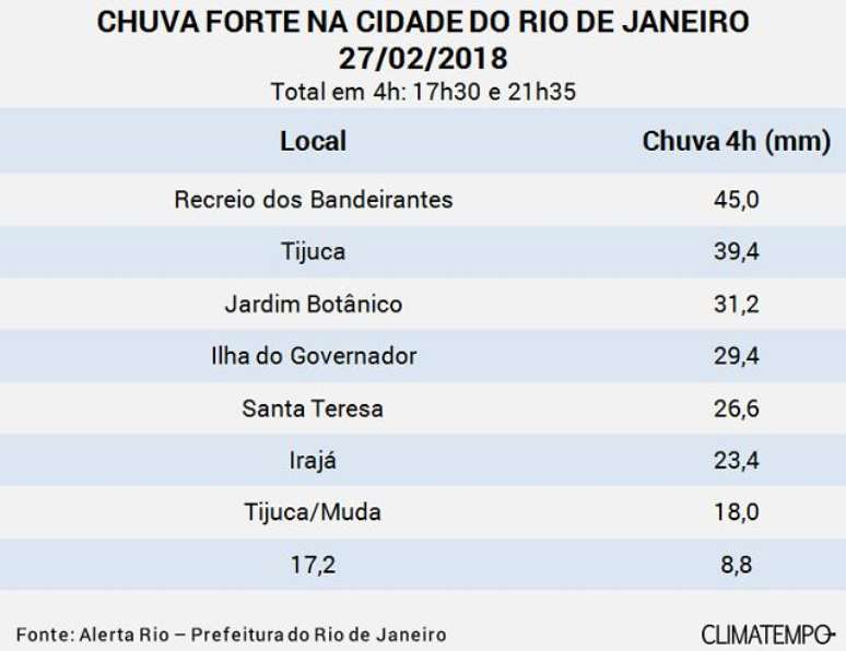 Durante a tarde, o CEMADEN registrou 48,8 mm em Valença no período de 3 horas, entre 13h50 e 16h50. Em Petrópolis choveu 27,9 mm entre 15h50 e 16h50. O Alerta Rio- Prefeitura do Rio de Janeiro registrou 11,4 mm em Bangu, apenas em 15 min, entre 16h45 e 17h00, o que tecnicamente é uma chuva forte.