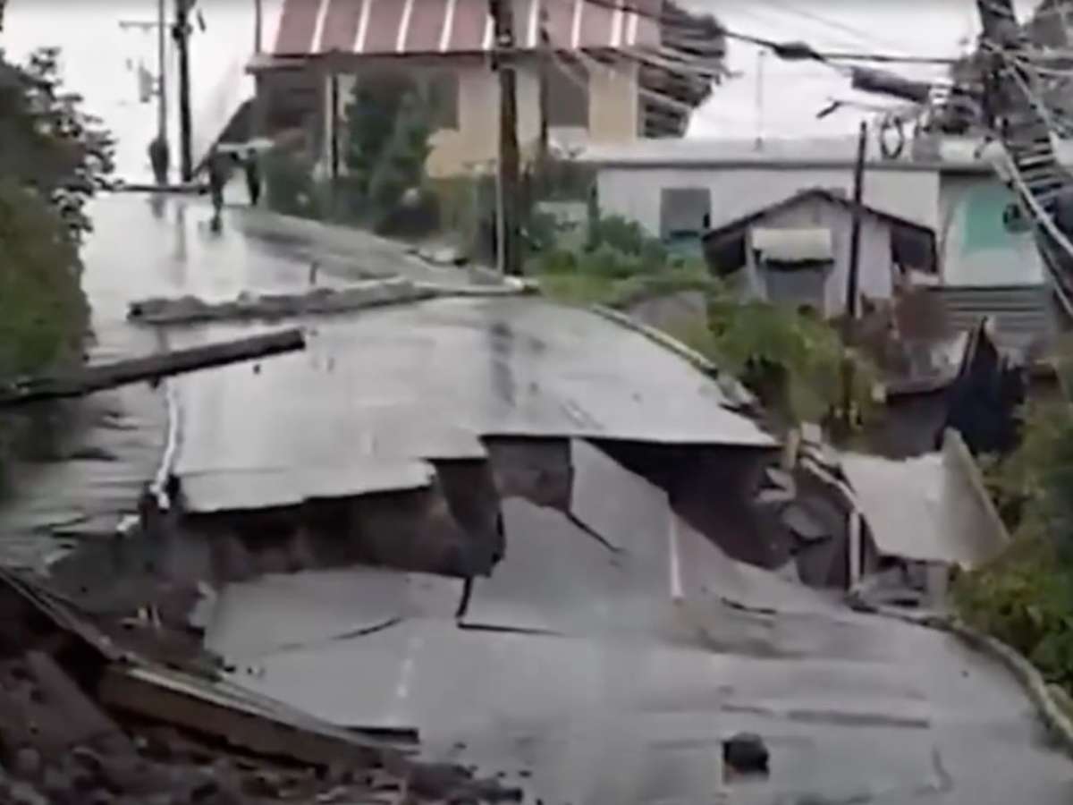 Rua desmorona em Gramado após chuva intensa, levando moradores a deixarem suas casas por precaução.