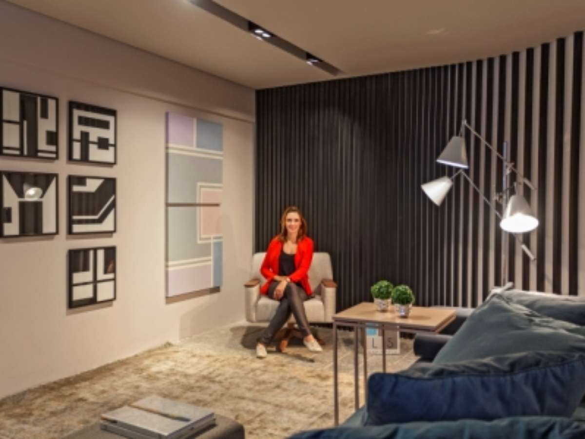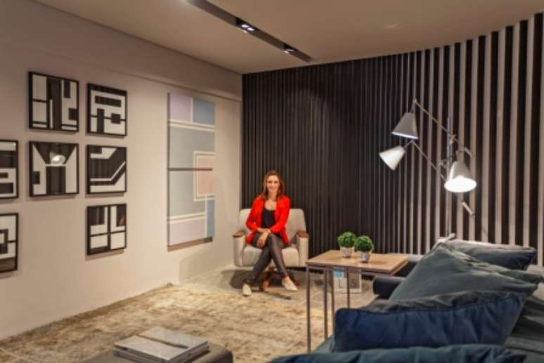 Em seu ambiente na Mostra Casa Construir, a designer utilizou o painel degradê feito em MDF preto comum, filetado com várias ripas detalhadas tecnicamente em uma progressão. Algo que fora pensado e detalhado pela profissional, com uma execução simples e econômica. Outro ponto de impacto do ambiente foi o posicionamento dos quadros, feitos de nanquim pela artista Luciana Hemont, colocados de uma forma descontínua, dando conceito ao projeto.