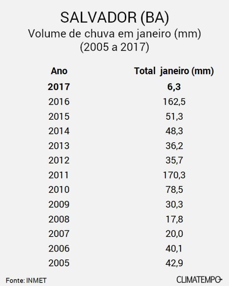Mas na escala anual, o mês de janeiro é o que tem a menor média de chuva em Salvador, capital da Bahia, o que significa que é uma época de pouca chuva. A média histórica de chuva é de aproximadamente 110 mm, segundo o Instituto Nacional de Meteorologia. Justamente por ter menos chuva, janeiro é parte do trimestre mais quente do ano junto com os meses de fevereiro e março.