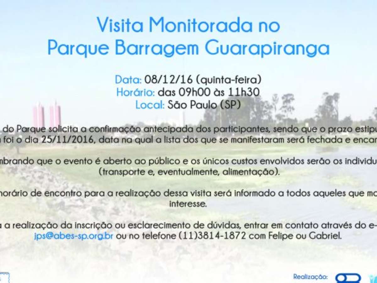 O programa Jovens Profissionais do Saneamento da ABES Seção São Paulo (JPS-SP/ABES-SP) realizará, no dia 8 de dezembro, quinta-feira, uma visita monitorada ao Parque Barragem Guarapiranga. O intuito da atividade é promover o conhecimento sobre o patrimônio ambiental e a gestão dos recursos hídricos do Município de São Paulo. A visita, que ocorrerá das 9h às 11h30, é direcionada aos associados, participantes do projeto e demais interessados .