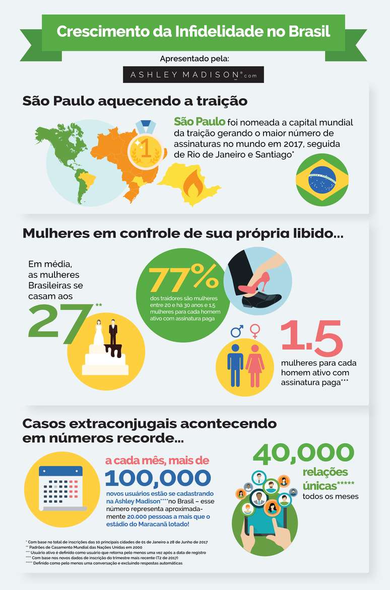 Sendo o lar de afrodisíacos naturais, como açaí e catuaba, o Brasil oferece um ambiente propício para a tentação. Números do Ashley Madison revelam que as mulheres do Brasil estão explorando opções além da monogamia, e revelam que mais mulheres do que homens se registram no site. Em 2017, para cada homem pagante existe 1,5 mulher ativa**** - o que indica uma forte demanda do sexo feminino no site e, possivelmente, uma nova era para a cultura de relacionamentos no Brasil. Este crescimento de inscrições de mulheres pode apontar uma tendência do desejo das mulheres brasileiras de assumir maior controle sobre suas vidas.