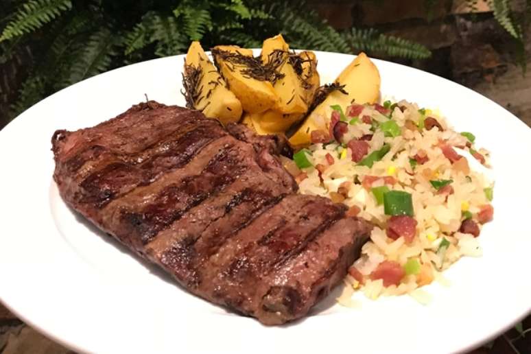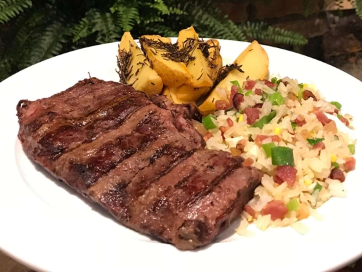 Prato: Raquete Angus Minerva, arroz tropical e batata rústica.