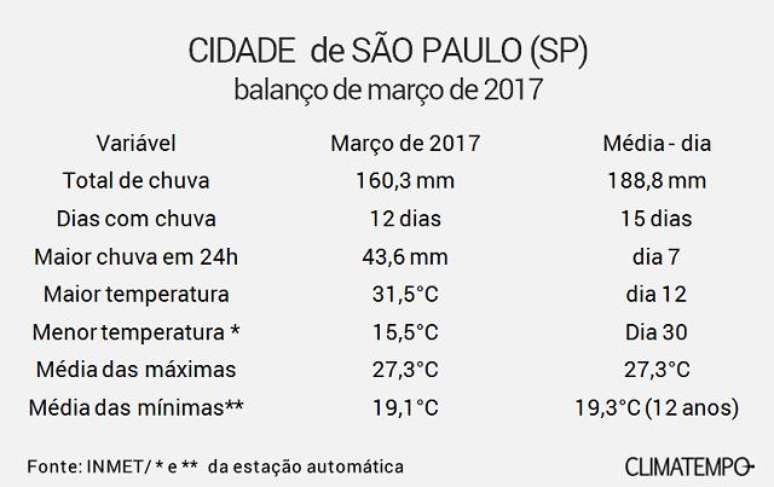 Em nota divulgando o balanço de chuva e de temperatura da cidade de São Paulo no mês de março, o Instituto Nacional de Meteorologia informou que a chuva de março de 2017 ficou 15% abaixo da média histórica. O INMET registrou 160,3 mm, sendo que a média é de 188,8 mm. Foi o março mais seco em 8 anos.