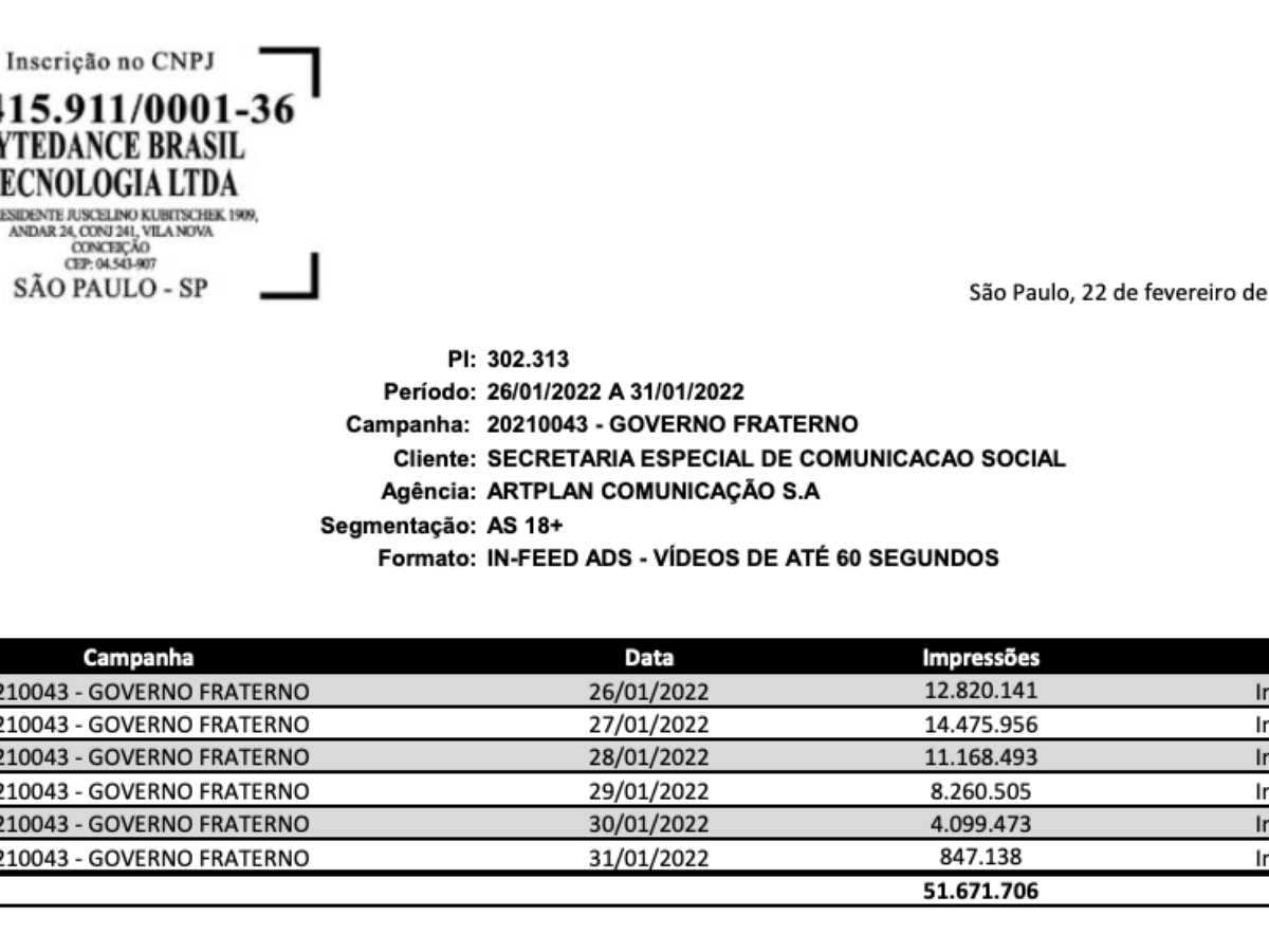 A Secom (Secretaria Especial de Comunicação) do governo Jair Bolsonaro (PL) pagou pela primeira vez por anúncios no TikTok. A pasta desembolsou R$ 157 mil para impulsionar publicações na plataforma entre 26 e 31 de janeiro deste ano, segundo nota fiscal emitida em março pela Bytedance, empresa responsável pelo TikTok. Os vídeos somaram 51,6 milhões de visualizações, de acordo com relatório da empresa.