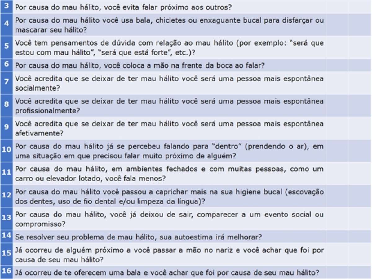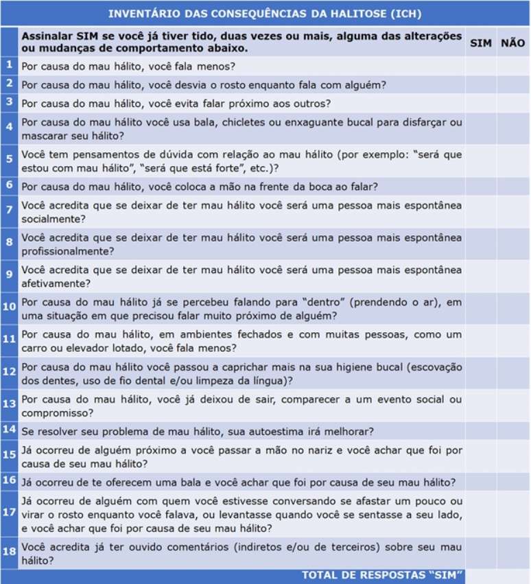 A pesquisa teve como objetivos validar um questionário denominado Inventário de Consequências da Halitose (Foto), desenvolvido para medir o grau de comprometimento que a queixa em ter halitose trouxe na vida dos pacientes, que comprometem a segurança, espontaneidade e autoestima destes e também estabelecer a relação dessas consequências com o transtorno de ansiedade social.