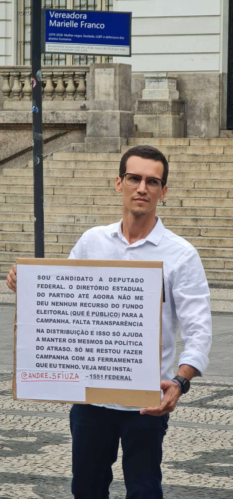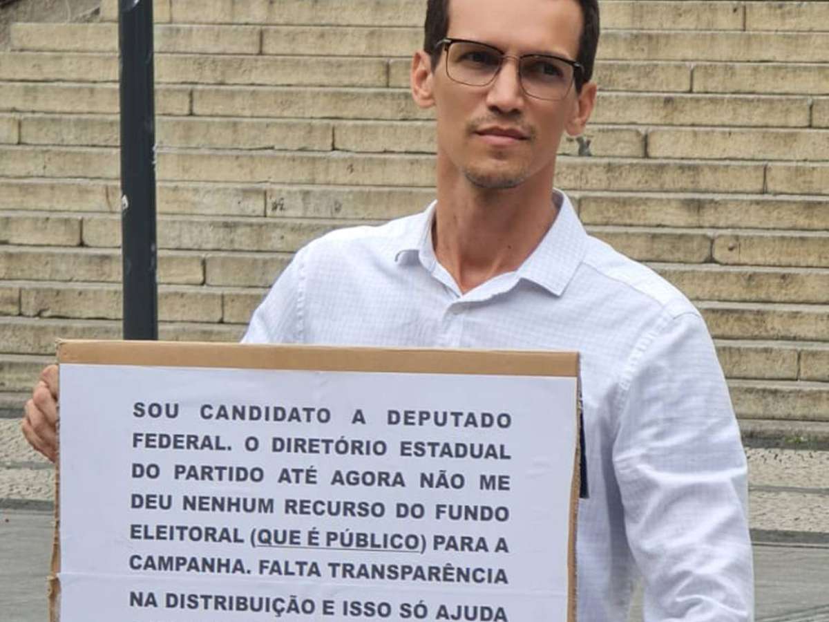 "Sou candidato a deputado federal. O diretório estadual do partido até agora não me deu nenhum recurso do Fundo Eleitoral (que é público) para a campanha. Falta transparência na distribuição e isso só ajuda a manter os mesmos na política do atraso. Só me restou fazer campanha com as ferramentas que eu tenho", diz o cartaz de papelão que Fiuza tem levado às ruas.