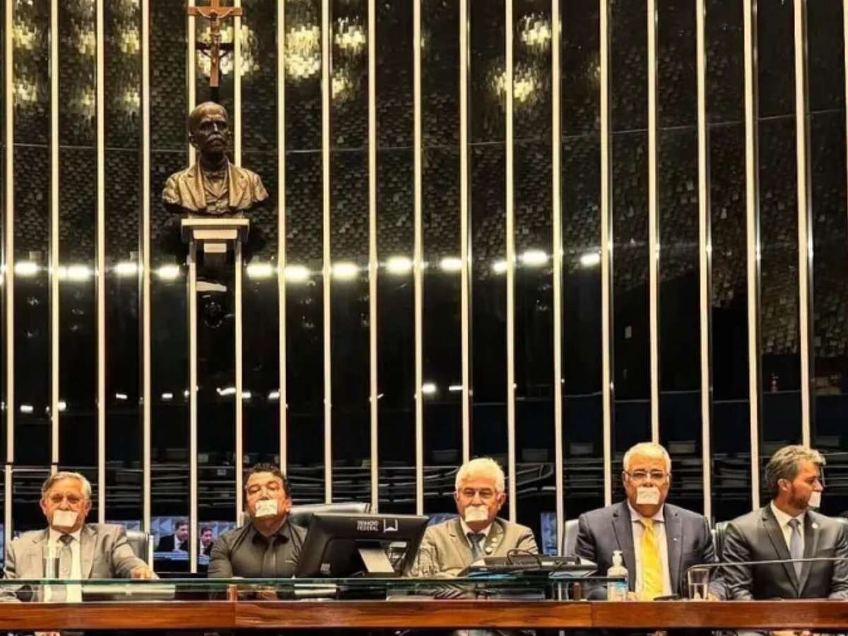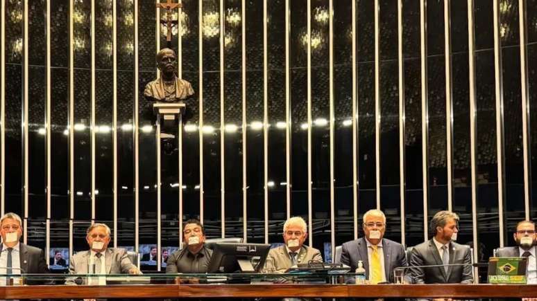 Nas mesas do Senados, os parlamentares apareceram com adesivos na boca em forma de apoio a Bolsonaro. Eles denunciaram uma suposta censura promovida pela Corte.