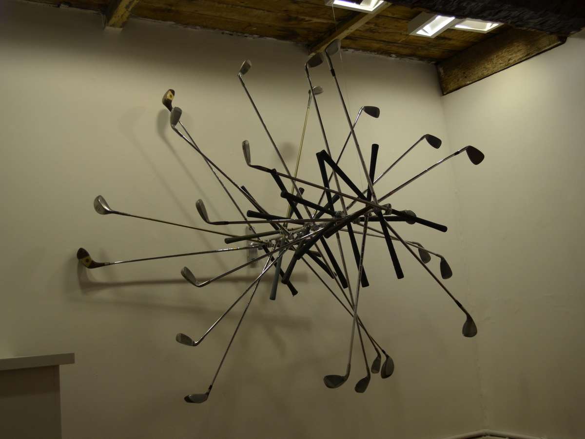 Felipe Barbosa vem utilizando material esportivo em seus trabalhos há cerca de 10 anos, desde bolas de futebol, basquete, chuteiras, camisas, até seus mais recentes trabalhos com raquetes de tênis e tacos de golfe.