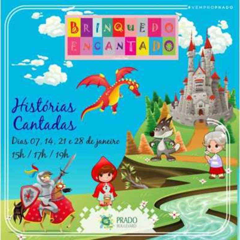 Ação - Brinquedo Encantado: Traz entretenimento para as crianças durante o mês de férias por meio de histórias cantadas e interativas para as crianças. Realização: 07 / 14 / 21 e 28 de Janeiro.