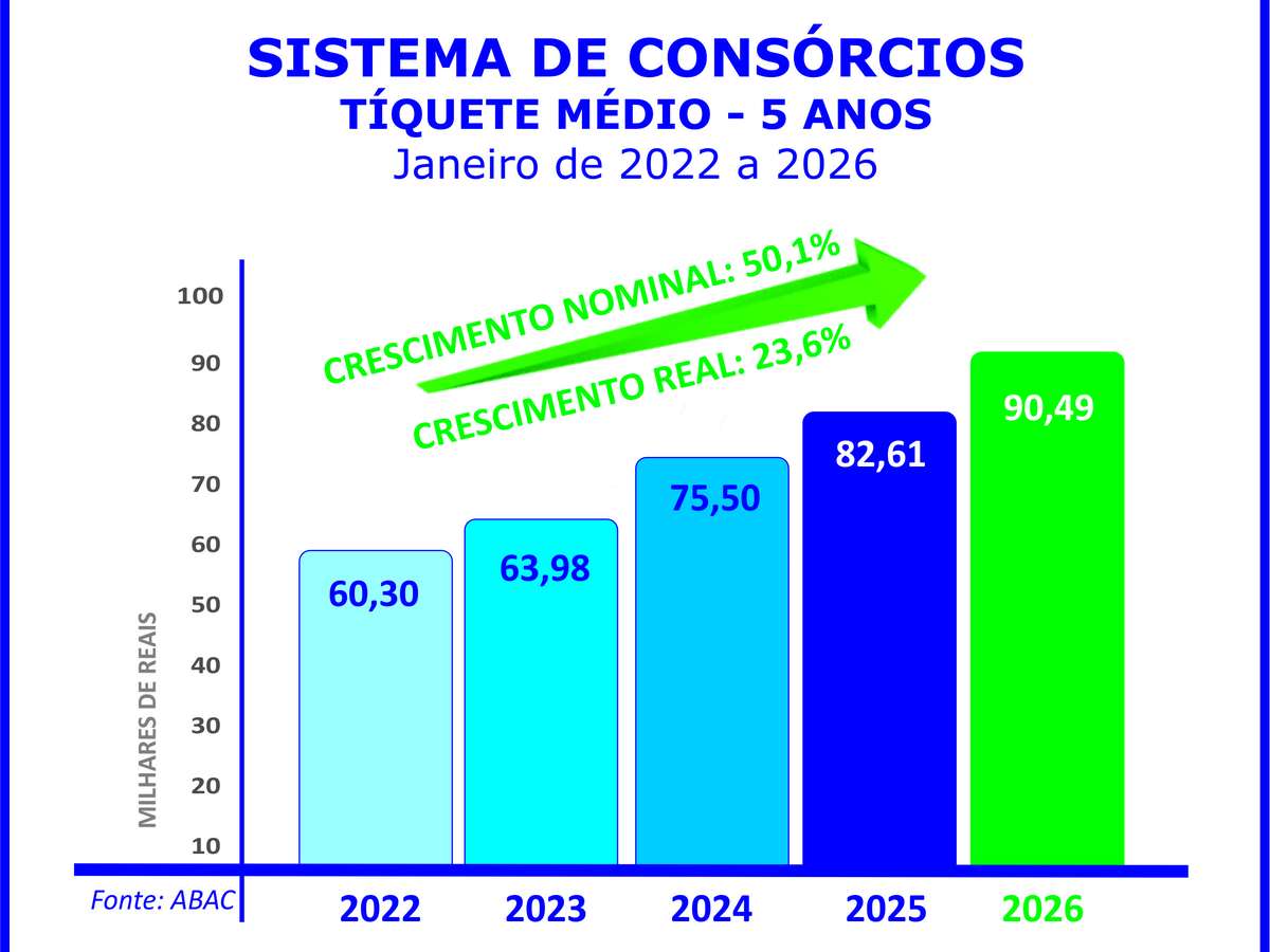 O tíquete médio de janeiro foi de R$ 90,49 mil. Houve alta de 9,5% sobre o do mesmo mês de 2025, que na ocasião apontou R$ 82,61 mil.