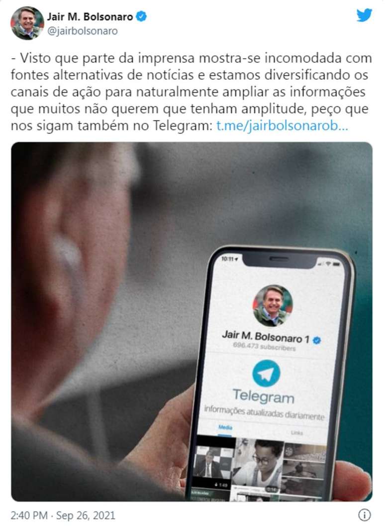 Após a publicação desta reportagem, o presidente divulgou em rede social uma mensagem em que diz que "parte da imprensa mostra-se incomodada com com fontes alternativas de notícias", e faz novo convite para segui-lo no Telegram. "Estamos diversificando os canais de ação para naturalmente ampliar as informações que muitos não querem que tenham amplitude", escreveu.