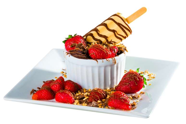 Grand Gateau: picolé coberto de chocolate, mergulhado em um delicioso bolinho de chocolate quente com morangos frescos em pedaços, chocolate ao leite e castanhas. R$ 22