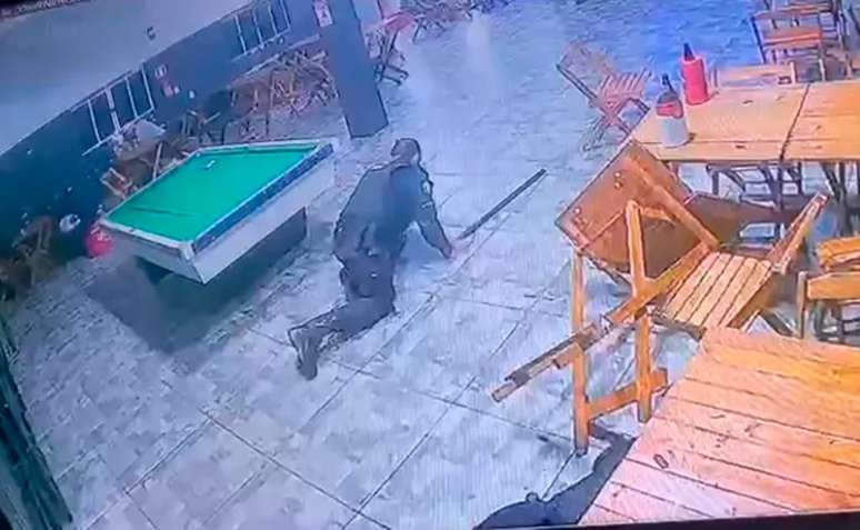 As imagens mostram o exato momento em que o casal é baleado na porta do estabelecimento. Antes disso, o suspeito havia deixado o local, conforme dito pela polícia. Mas, em seguida, ele volta para efetuar os disparos.