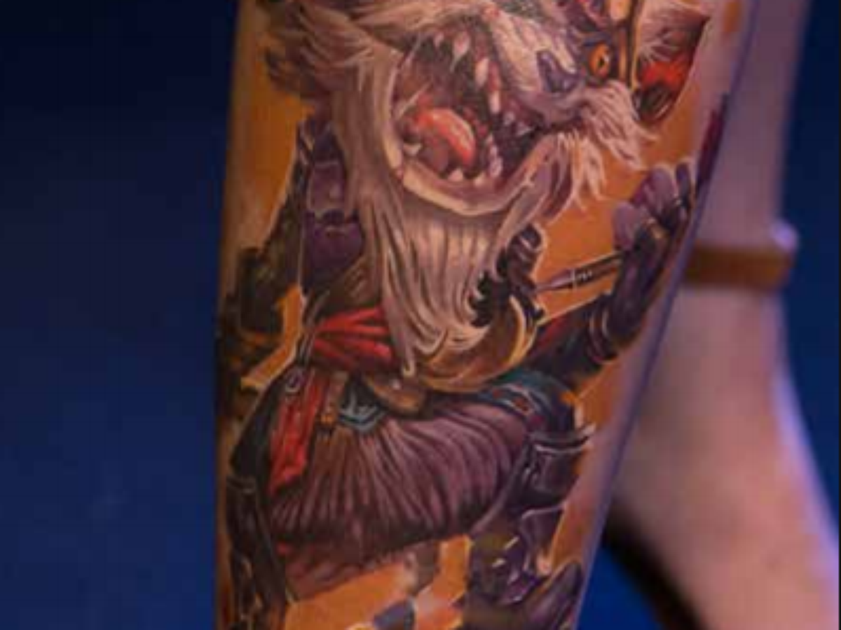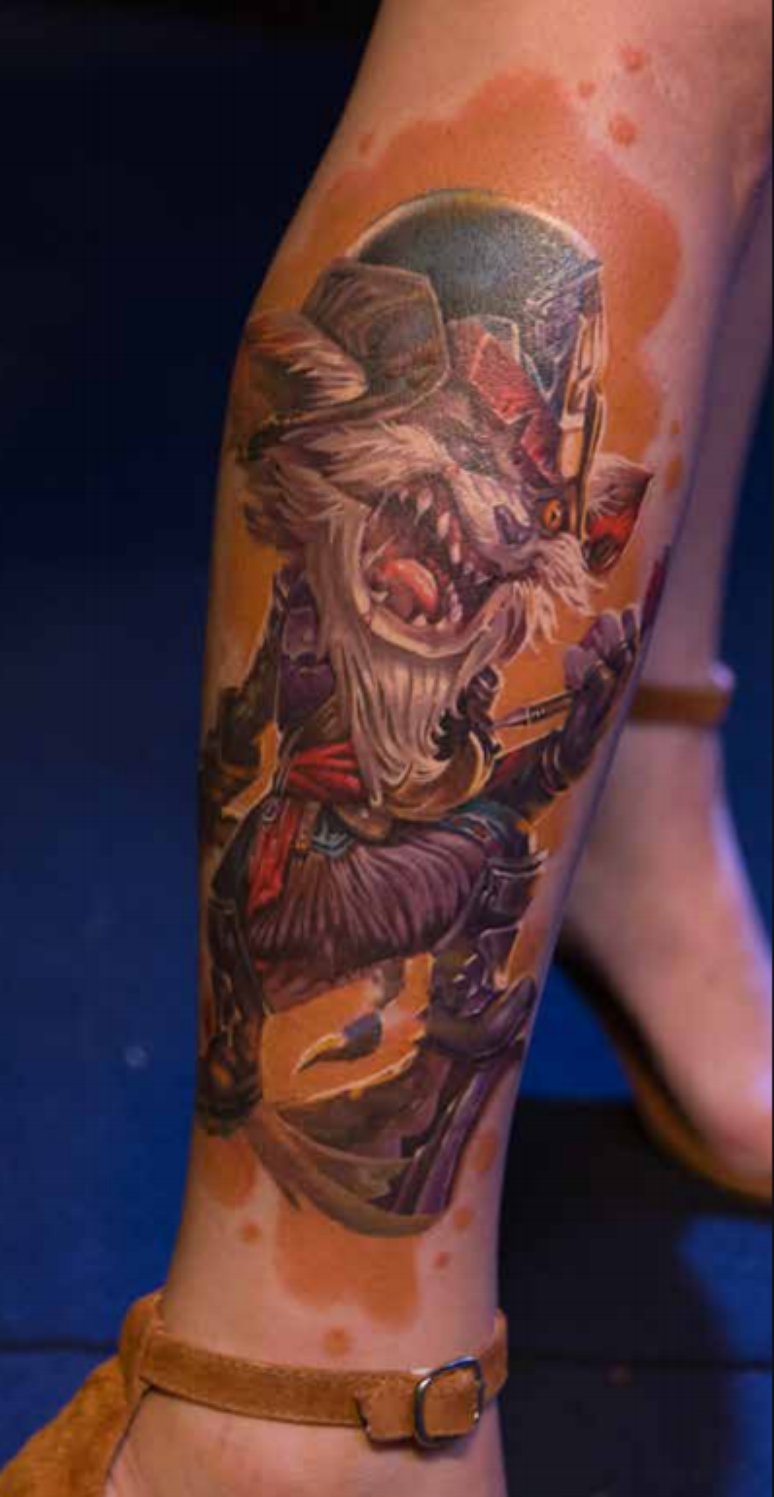 A sua tatuagem vencedora é a adaptação para a pele de um personagem do jogo League of Legends (LoL), criada a partir de uma animação gráfica digital. "Meu estilo é o realismo preto e branco, mas optei em tatuar o desenho digital no concurso da Tattoo Week porque a variação de cores é muito grande em um espaço pequeno, permitindo um resultado diferenciado", explica o tatuador.