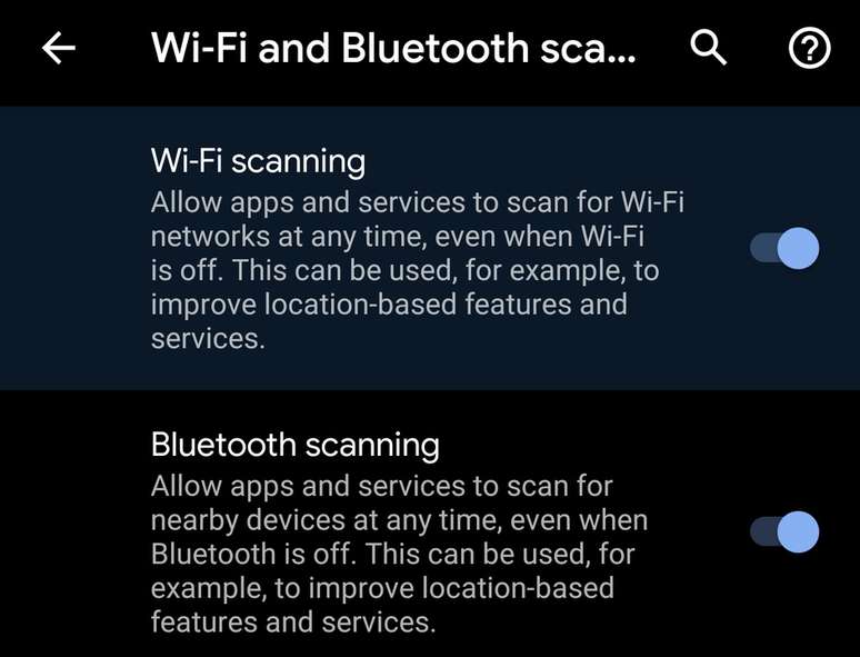 Segundo o site PhoneArena, o Android Q trará uma uma função que desliga a busca de redes Wi-Fi e sinais de localização do seu aparelho. Mesmo quando você desliga a rede Wi-Fi e Bluetooth no seu smartphone, ele continua enviando sinais de localização, algo que acaba por sugar a sua bateria com facilidade. No Android Pie, existe uma função interna que diminui as tentativas de busca do sistema, para uma em cada 30 segundos em aplicativos em operação, e uma a cada 30 minutos para apps em segundo plano.