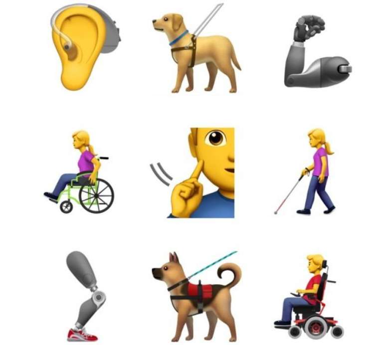 A Apple submeteu ao Unicode Consortium um arquivo para apresentar novos emojis de representações de acessibilidade, desde personagens em cadeiras de rodas a cães-guias, braços e pernas biônicos. São 9 tipos novos de caracteres propostos, mais as variações étnicas de cada um.