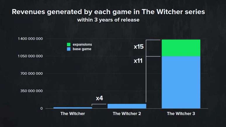 Como se tratava de uma apresentação financeira para investidores, a CD Projekt Red abriu alguns números. Em comemoração ao 10º aniversário da franquia The Witcher, a empresa divulgou que a série bateu a marca de 33 milhões de cópias vendidas. Um dado interessante é a comparação entre os três títulos: The Witcher 3 vendeu 11 vezes mais que o 2º e 15 vezes mais que o 1º.