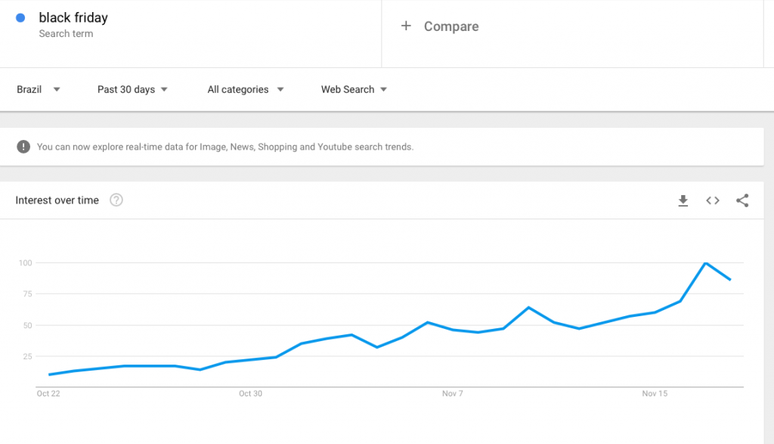 Ao acessar o Google Trends, vemos que as buscas pelo termo "Black Friday" vêm crescendo exponencialmente desde o início do mês, tendo seu maior pico até então na última sexta-feira (17).
