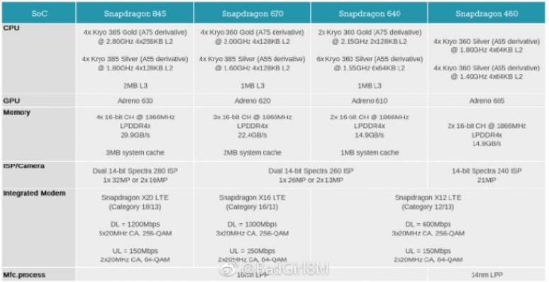 Em uma publicação na rede social chinesa Weibo, um usuário diz ter tido acesso às especificações dos novos Snapdragon 670, 640 e 460. Mais do que isso, ele mostrou uma tabela comparativa, que coloca as características dos chips lado a lado, como a Qualcomm realmente costuma fazer quando anuncia um novo componente.