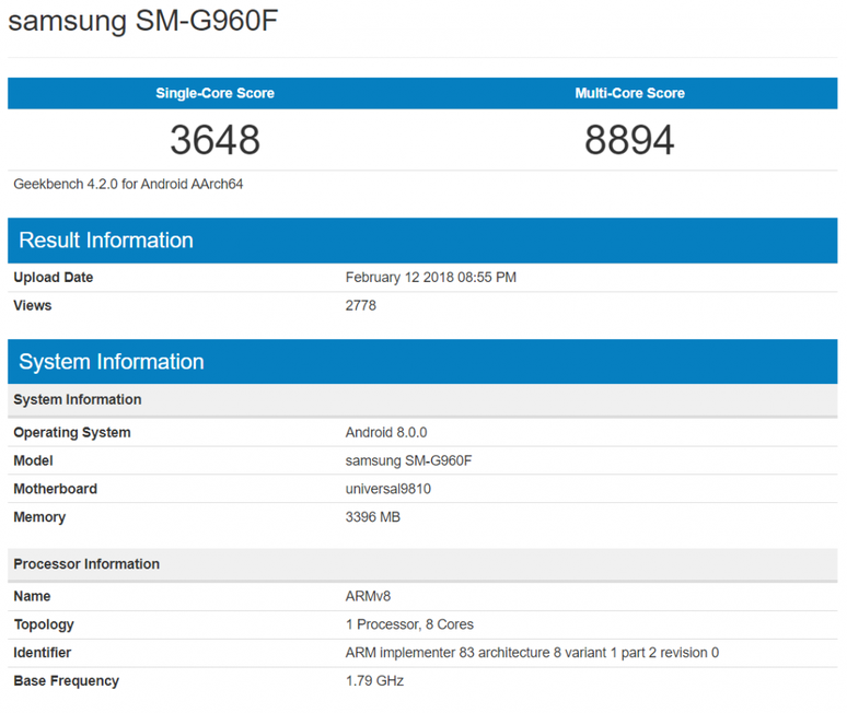 Com número de modelo SM-G960F, o smartphone da sul-coreana equipado com SoC Exynos 9810 mostrou que é um verdadeiro monstro, marcando 3.648 pontos nos testes single-core e nada mais nada menos que 8.894 pontos nos testes multi-core. Para termos uma noção do significado disso, testes anteriores realizados com a variante equipada com Snapdragon 835 — que será vendida exclusivamente nos Estados Unidos — mostram um escore de 2.378 e 8.132 pontos nos testes com um núcleo e mais multi-core, respectivamente.