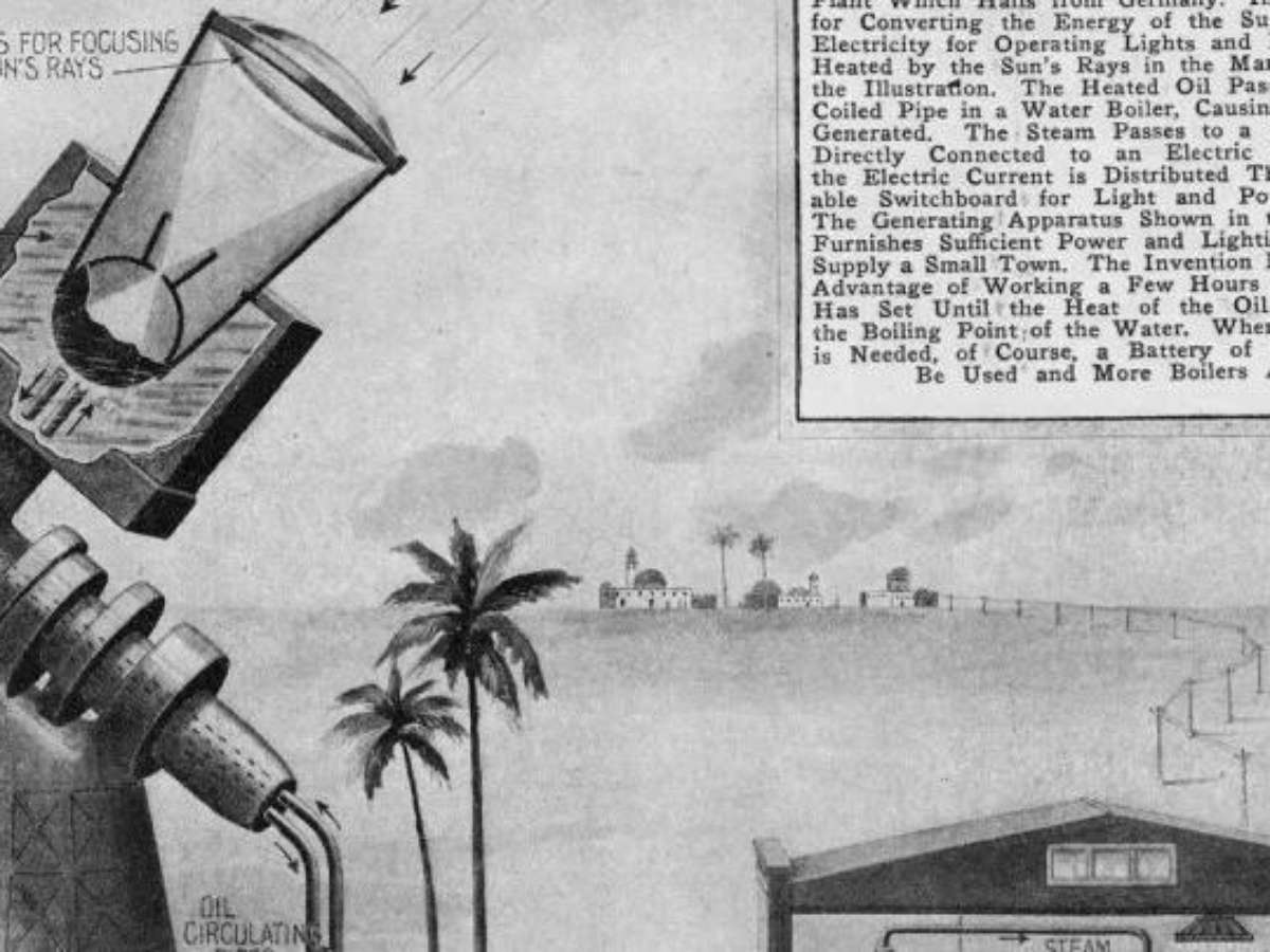 O artigo, intitulado Electricity From The Sun (Eletricidade do Sol), foi originalmente veiculado em 1923 e imaginava algo como um girassol mecânico gigantesco capaz de "gerar energia para iluminar uma pequena cidade". Como se pode apreender do diagrama publicado na revista (abaixo, em inglês), o funcionamento seria razoavelmente simples: os raios do sol incidem sobre uma enorme lente, que os faz convergir na direção do óleo acumulado na estrutura.