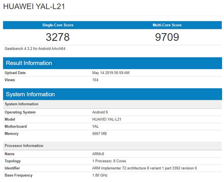 O dispositivo também fez 9709 pontos na avaliação de múltiplos núcleos, mantendo-se na média dos smartphones Android de sua categoria. Além de revelar que o aparelho deve ser lançado com o Kirin 980, o Geekbench também mostrou que o Honor 20 deve chegar com 6 GB de memória RAM, mas especula-se que uma variante de 8 GB também seja vendida.