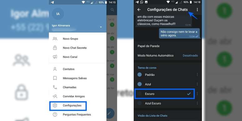 3. Logo abaixo escolha o tema Escuro, na seção "Tema de cores".