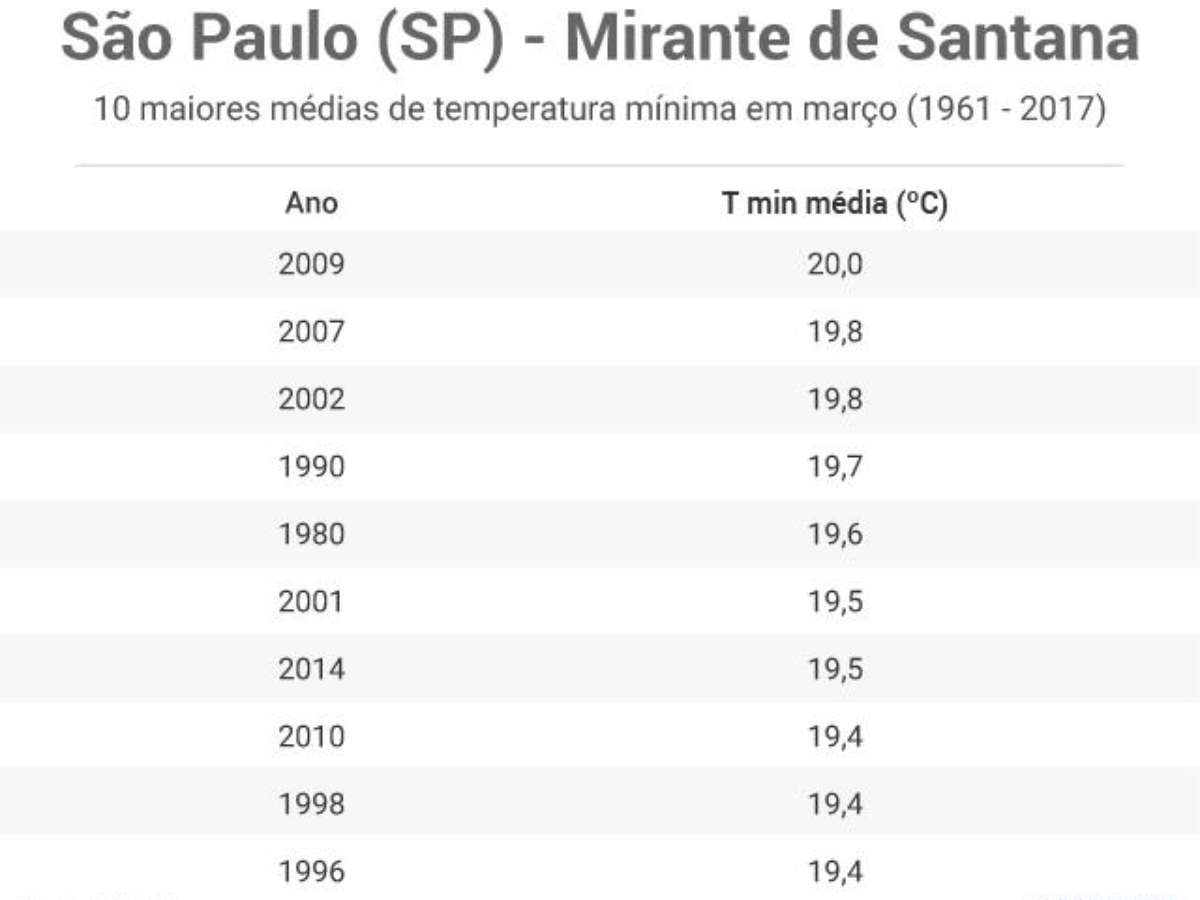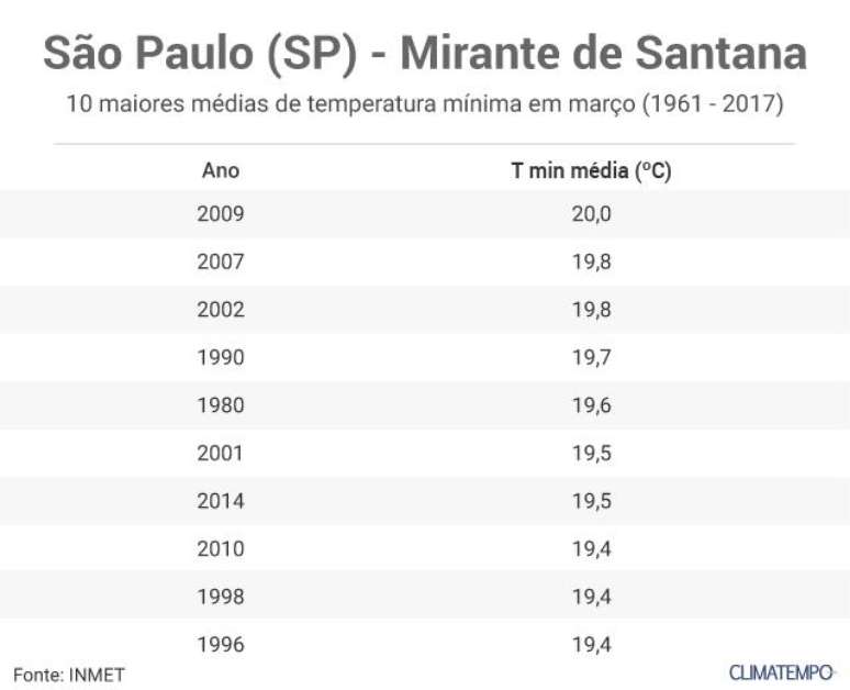 Pela medição do Instituto Nacional de Meteorologia no Mirante de Santana, na zona norte da capital paulista, a média das temperaturas mínimas registradas em 21 dias foi de 20,7°C. O valor está 2,6°C acima da referência climatológica para março que é de 18,1°C, considerando o período de 1943 a 2010.