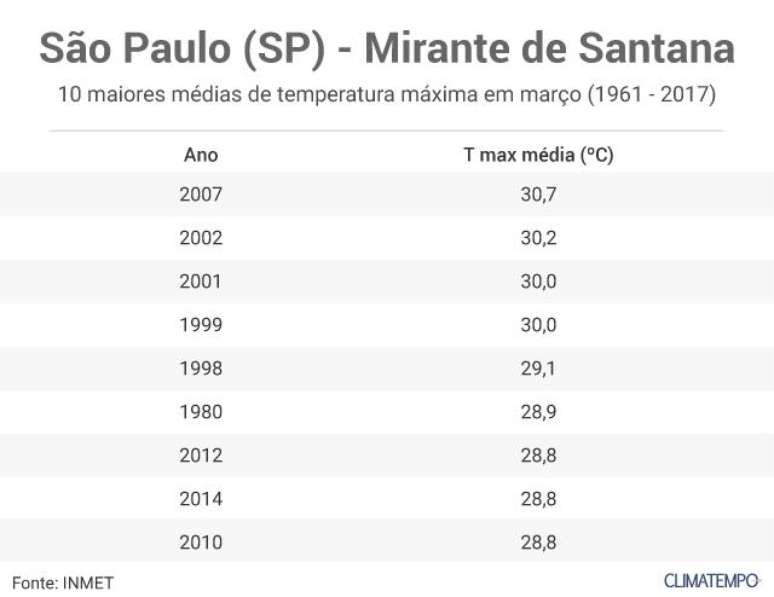 Normalmente março é um mês quente na cidade de São Paulo. As médias da temperatura mínima e da máxima de março são as segundas mais elevadas perdendo apenas para fevereiro, que historicamente é o mês mais quente na capital paulista.