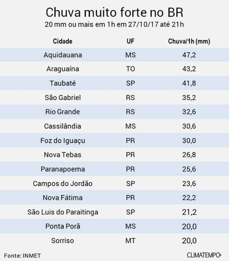 Tecnicamente considera-se chuva forte um volume igual ou maior a 20 mm acumulados em 1 hora. Durante o dia 27 de outubro de 2017, especialmente à tarde e à noite, violentos temporais foram observados de norte a sul do Brasil. Volumes de chuva muito acima de 20 mm por hora ocorreram em diversas cidades. Além dos raios, a chuva intensa em pouco tempo muitas vezes veio acompanhada de rajadas de vento muito fortes, da ordem de 80 km/h. É vento suficiente para causar destelhamento e queda de galhos médios e até árvores pequenas. As ocorrências mais impressionantes foram em Taubaté, em São Paulo, onde choveu 41,8 mm em 1 hora e o aeroporto local registrou uma rajada com 109 km/h, e na região de Aquidauana, em Mato Grosso do Sul, onde o Instituto Nacional de Meteorologia registrou 47,2 mm em 1 hora.