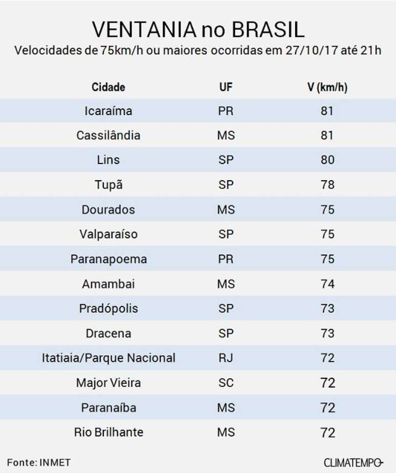 Ventania no Brasil em 27/10/17 (Fonte: INMET)