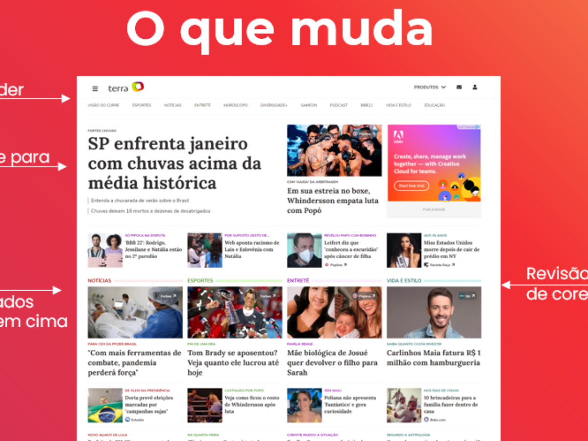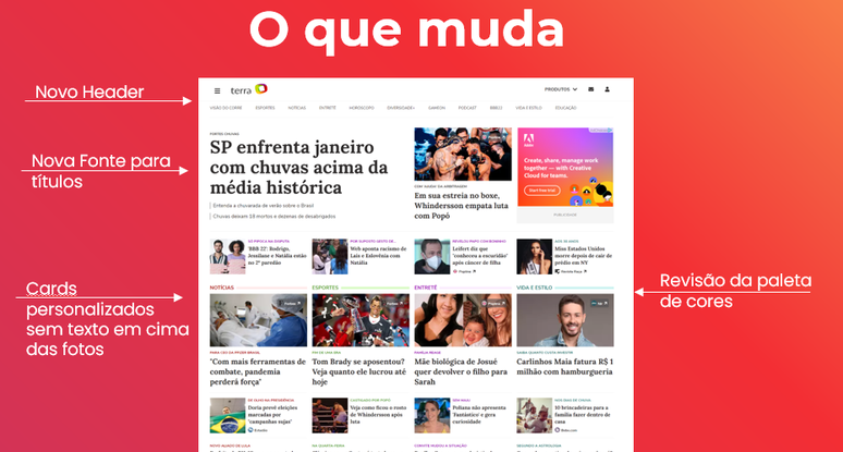 O Terra está de cara nova! A partir desta quinta-feira (17) o portal estreia um novo projeto gráfico, com visual mais leve e arejado, para oferecer cada vez mais protagonismo ao conteúdo informativo e também de entretenimento.