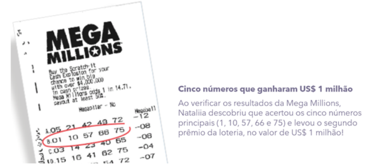 Nossos clientes não somente jogam nas loterias, eles também ganham! Há pouco tempo atrás, uma jogadora ucraniana chamada Nataliia ganhou um prêmio de US$ 1 milhão jogando na loteria Mega Millions usando o serviço. Em seus 23 anos de história, a TheLotter construiu uma reputação que fala por si, com mais US$ 130 milhões de dólares pagos para mais de 9 milhões de bilhetes ganhadores do mundo todo.