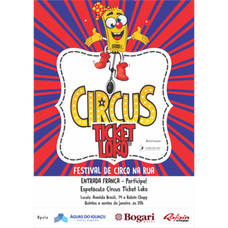 A grande estreia do espetáculo Circus Ticket Loko será nesta sexta-feira 30/12, às 20h, em frente aos hotéis Bogari e Águas do Iguaçu, no início da Avenida Brasil. Em janeiro, os espetáculos acontecem também no Rafain Chopp, na Jorge Schimmelpfeng.