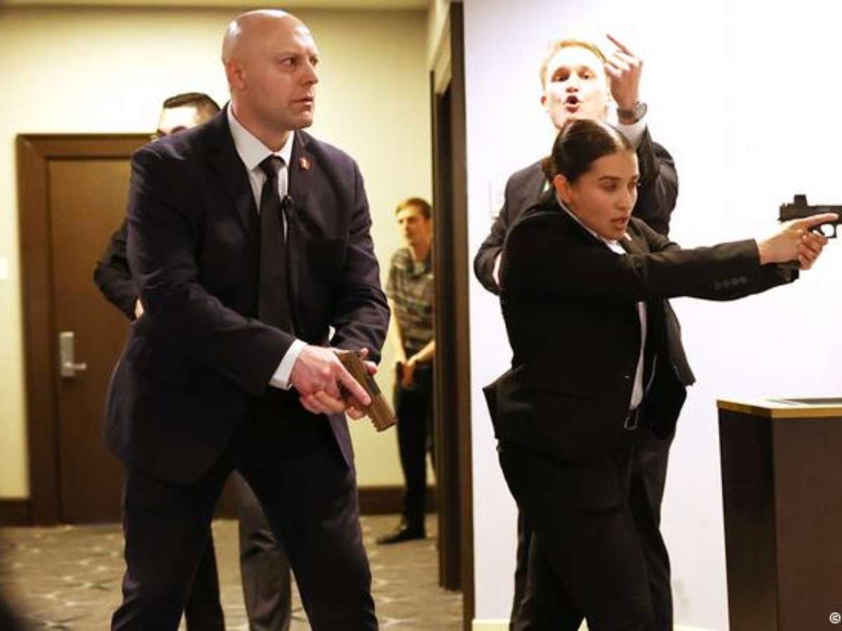 Segundos após os disparos, agentes do Serviço Secreto cercaram Trump, que pareceu escorregar levemente ao ser retirado às pressas. Outra equipe moveu o vice-presidente JD Vance com rapidez.