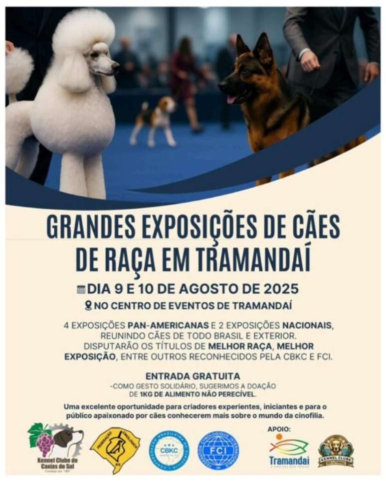 Nos dias 9 e 10 de agosto, o universo pet vai tomar conta de Tramandaí. A cidade do Litoral Norte gaúcho será sede da Exposição Nacional e Internacional de Cães, evento que promete movimentar o Parque Municipal de Eventos Dr. Eliseu Lemos Padilha com dezenas de cães de diferentes raças e origens — incluindo participantes do exterior.