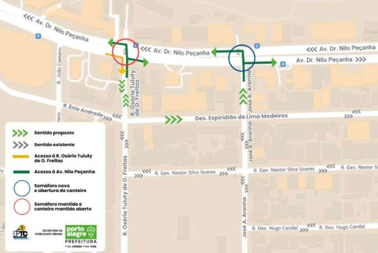 Já no bairro Três Figueiras, na Zona Norte da capital, um novo projeto de sinalização viária - que permitirá a transposição dos veículos da Nilo Peçanha em direção ao Centro pela rua Osório Tuyuty e pela José Aranha - entra em funcionamento. As alterações foram implantadas a partir do diálogo com moradores do bairro Três Figueiras para dar mais fluidez ao trânsito no local (veja o mapa abaixo). A Empresa Pública de Transporte e Circulação (EPTC) colocará em funcionamento, a partir das 9 horas, o semáforo da Nilo Peçanha com a José Antônio Aranha, medida que permite a passagem dos veículos com maior segurança. Confira o mapa abaixo.