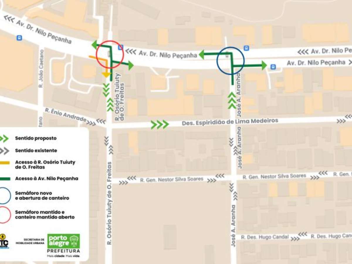 A partir desta terça-feira, 10, um novo projeto de sinalização viária - que permitirá a transposição dos veículos da Nilo Peçanha em direção ao Centro pela rua Osório Tuyuty e pela José Aranha - entra em funcionamento. As alterações foram implantadas a partir do diálogo com moradores do bairro Três Figueiras para dar mais fluidez ao trânsito no local. A Empresa Pública de Transporte e Circulação (EPTC) colocará em funcionamento, a partir das 9 horas, o semáforo da Nilo Peçanha com a José Antônio Aranha, medida que permite a passagem dos veículos com maior segurança. Confira o mapa abaixo.