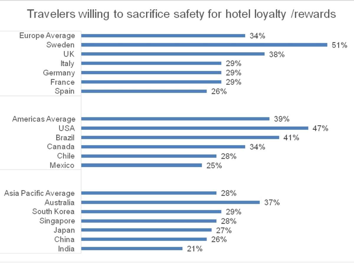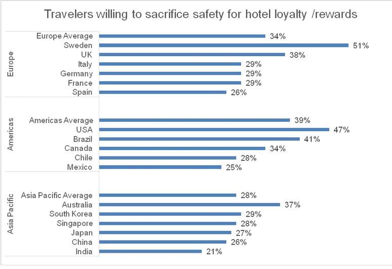 Um levantamento global feito pela Carlson Wagonlit Travel (CWT), principal empresa do mundo especializada em gestão de viagens de negócios, mostrou que três em cada 10 viajantes de negócios estão dispostos a sacrificar itens de segurança por programas de fidelidade de hotéis. Viajantes das Américas são os mais propensos a valorizar mais as recompensas (39%), seguidos por europeus (34%) e itinerantes da Ásia/Pacífico (28%).