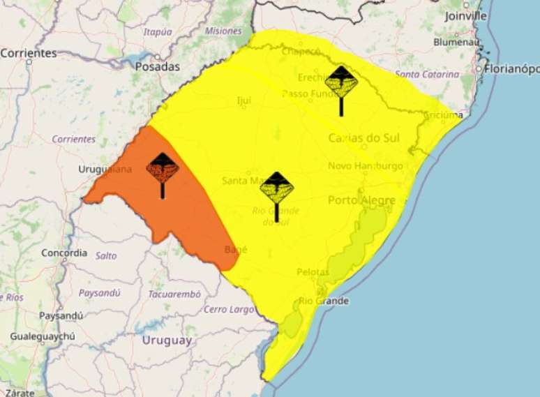 Três avisos meteorológicos foram emitidos para o Rio Grande do Sul pelo Instituto Nacional de Meteorologia (INMET), alertando para riscos associados a tempestades, chuvas fortes e ventos intensos. A sequência de fenômenos climáticos extremos começa ao meio-dia desta quarta-feira (16) e segue até às 15h de quinta-feira (17).